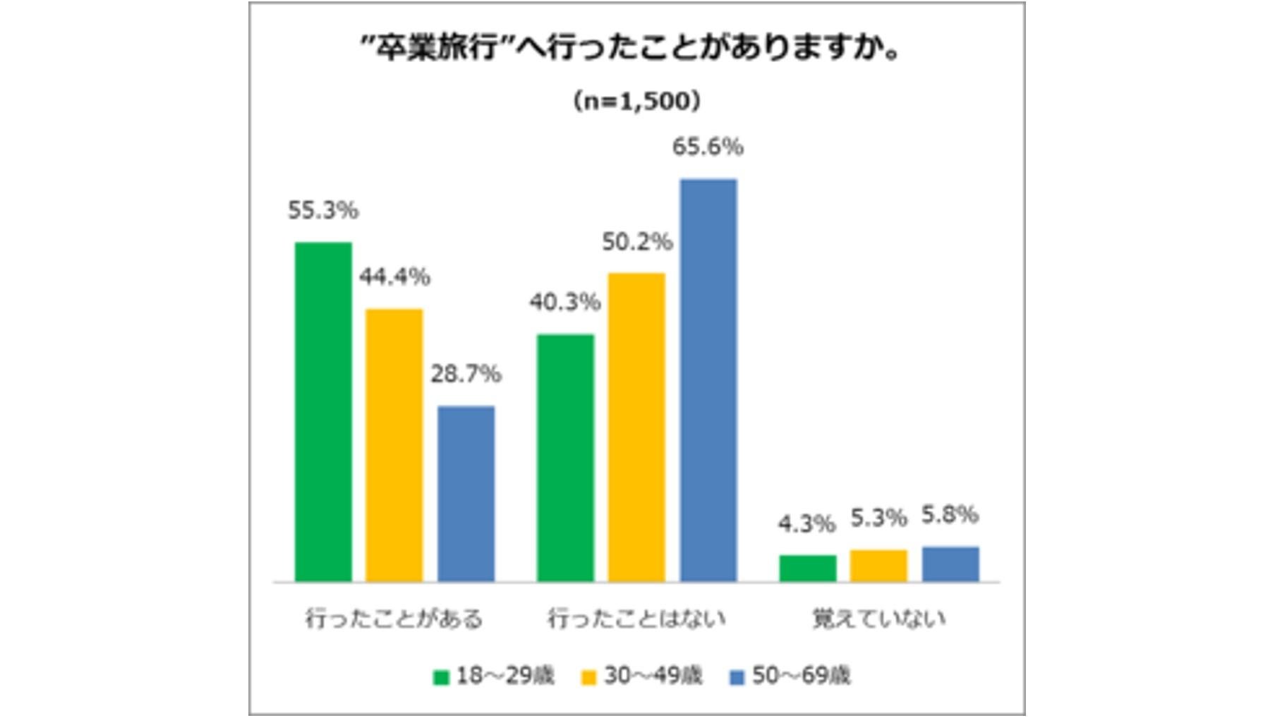 Have you ever taken a graduation trip? 50% of those in their teens and twenties, 40% of those in their 30s and 40s, and 30% of those in their 50s and 60s said they "went"