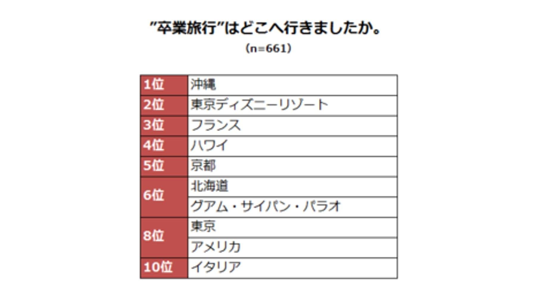 When we asked those who answered "I have been on a graduation trip" where they went, the top answer was "Okinawa," followed by "Tokyo Disney Resort," "France," "Hawaii," and "Kyoto."The places that ranked highly in Japan are often cited as popular travel destinations, regardless of whether they are for graduation trips or not, but among the countries overseas, France came in third.