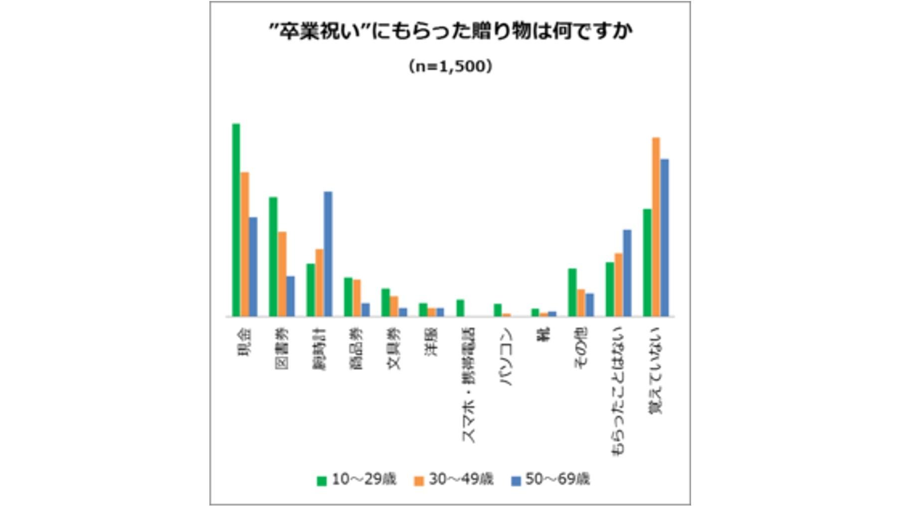 Next are "graduation gifts" given by family and relatives to celebrate graduation from elementary, junior high, high school, etc. When asked to select multiple answers about the gifts they had received as "graduation presents" in the past, the most common answer among those aged 50-69 was "wristwatches," while the most common answer among those aged 18-29 and 30-49 was "cash," indicating that in recent years, "graduation presents" have shifted from physical items to money. The top choices by age group were "cash," "book voucher," and "wristwatch" for those aged 18-29, "cash," "book voucher," and "wristwatch" for those aged 30-49, and "wristwatch," "cash," and "book voucher" for those aged 50-69. This shows that the most popular gifts for "graduation celebrations" are "cash," "book voucher," and "wristwatch."Among those aged 18 to 29, gifts such as "smartphones/cell phones" and "computers" were also chosen.
