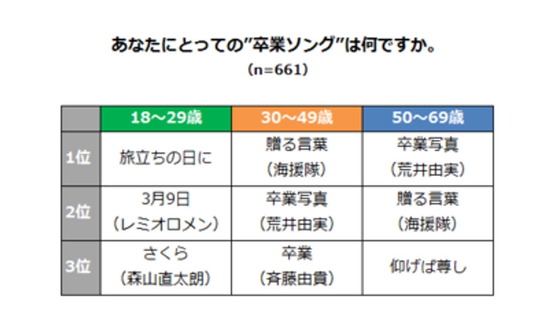 When we hear the word "graduation," naturally, thoughts of "graduation songs" that evoke memories for each of us come to mind. When asked to give free answers about what their "graduation song" is, among those aged 18 to 29, the choral song "Tabidachi ni Hi" (On the Day of Departure), composed by a junior high school teacher in 1991, came in first. Meanwhile, for those aged 30 to 49, the number one song was "Okuru Kotoba," the theme song for the popular TBS TV drama "3-nen B-gumi Kinpachi Sensei," which aired from 1979 to 2011, while for those aged 50 to 69, the number one song was "Graduation Photo," a hit song by Yumi Arai (now Yumi Matsutoya), released in 1975. Looking at the other rankings, the "graduation songs" show distinct characteristics for each generation.