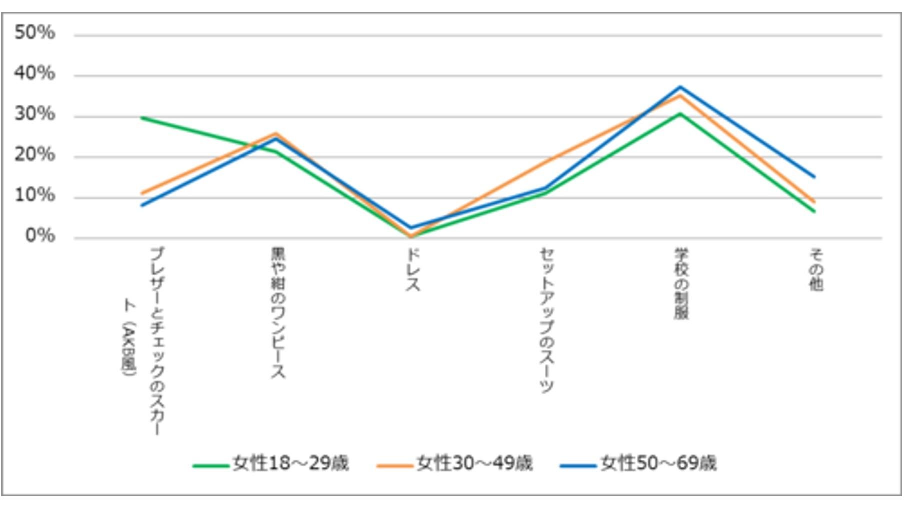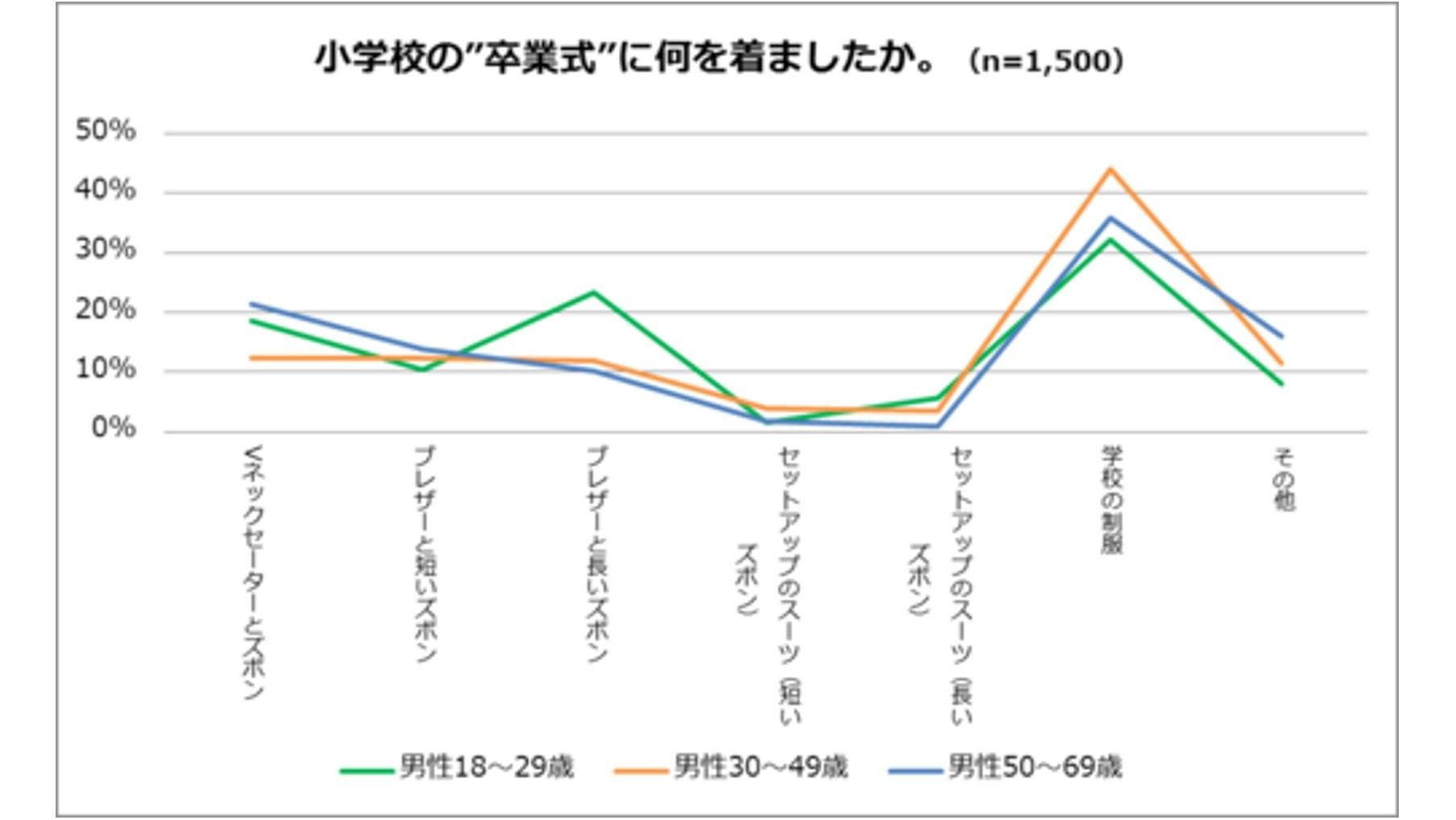 Finally, there is the most important event in graduation: the graduation ceremony. When we asked what elementary school graduation outfits were worn, excluding "school uniforms," the most common answer among women aged 18 to 29 was "a blazer and checked skirt (AKB48 style)," perhaps influenced by the popularity of idol groups in uniforms in recent years. For women aged 30-49 and 50-69, the most popular answer remained the classic "black or navy dress."On the other hand, the most common answer among men was "blazer and long pants" for those aged 18-29, and "V-neck sweater and pants" for those aged 30-49 and 50-69. This suggests that recently, perhaps in line with the popularity of AKB-style blazers among women, men are also increasingly wearing blazers.