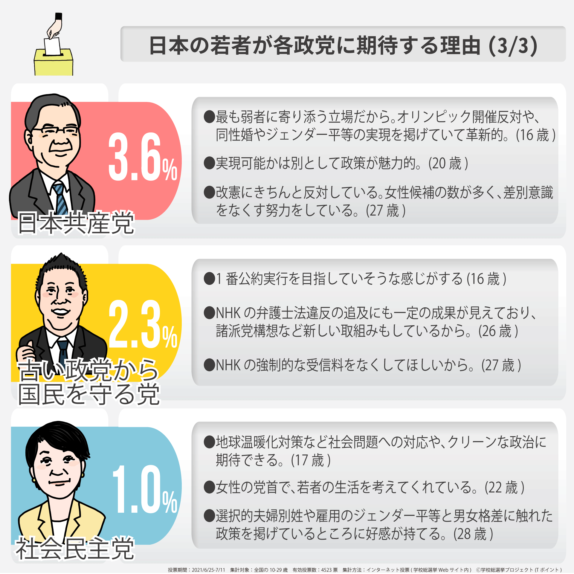 このたび「学校総選挙プロジェクト」では、2021年6月25日(金)~7月11日(日)までの間、オンライン投票によって「期待する政党」について募ったところ、全国の10~29歳から4,523票の投票をいただきました。その結果、5割を超える若者が「自由民主党」(50.8%)に投票し、その理由として「引き続きコロナ感染防止に全力を尽くしてほしい。途中で政権が変わるとややこしくなりそう。」「コロナという未曽有の事態でも上手く国を回している。非難もあるが、なんだかんだ上手くいっているのでは。」「他の党よりマシなだけで期待値は低い」などを挙げています。次いで「立憲民主党」(9.2%)に投票した若者が多く、その理由として「最大野党だから。また最近はよく対案を出している」「選択的夫婦別姓や同性パートナーへの権利等に対する考え方に賛同できる。未来のために政治をしていると感じる」などを挙げています。続いて「日本維新の会」(7.5%)、「国民民主党」(7.1%)、「公明党」(5.3%)、「れいわ新選組」(4.5%)、「日本共産党」(3.6%)、「古い政党から国民を守る党」(2.3%)、「社会民主党」(1.0%)となり、「その他の政党」は 8.7%との結果となりました。